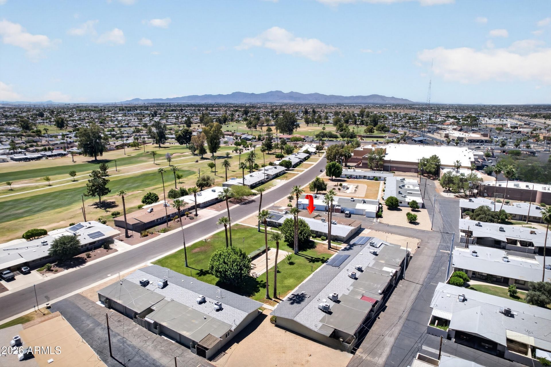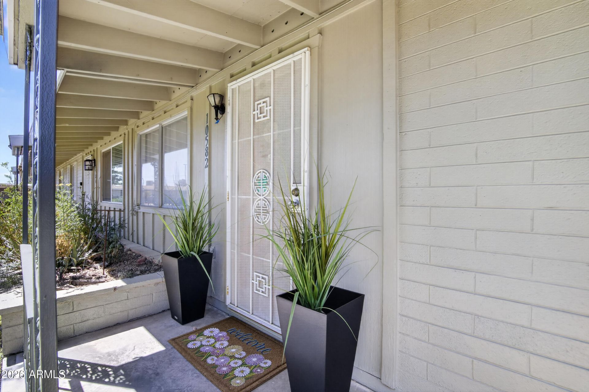 Beautiful1 Bedroom, 1 Bathroom Home with Oversized Garage. Eat-In Kitchen Features White Cabinets, White Appliances, and Cabinet Pullouts. Bathroom Showcases Custom Tile with Grab Bar for Improved Accessibility, Safety and Support. Home Features Vaulted Ceilings, Exposed Brick, Neutral Colors, Wood Plank Tile Flooring, and Freshly Painted Interior/Exterior. Extended 1 Car Plus Garage with Mini Split, Insulated Garage Door, and Storage. Enclosed Patio Double as Golf Cart Garage. Trane AC Installed 2021, Water Heater 2023, and Sewer 2023. Front Courtyard has Natural Grass, Seating, and Shaded Trees. Home is Conveniently Located Near Stores, Restaurants, Shopping, Recreation Centers, Parks, Golf, Lakes, Pickleball, Clubs, Pools, Spas, Hospitals, US 60, Loop 101, and Loop 303. Sun City offers an Extensive Array of Active Adult Amenities, Featuring Eight Recreation Centers, 8+ Golf Courses, and over 120 Chartered Clubs. Residents Enjoy Top-Tier Facilities including Swimming Pools, Bowling, Pickleball, Arts and Crafts Studios, and Fitness Centers. The Community is Designed for Engagement, Featuring Theaters, Lakes, and Social Clubs.
