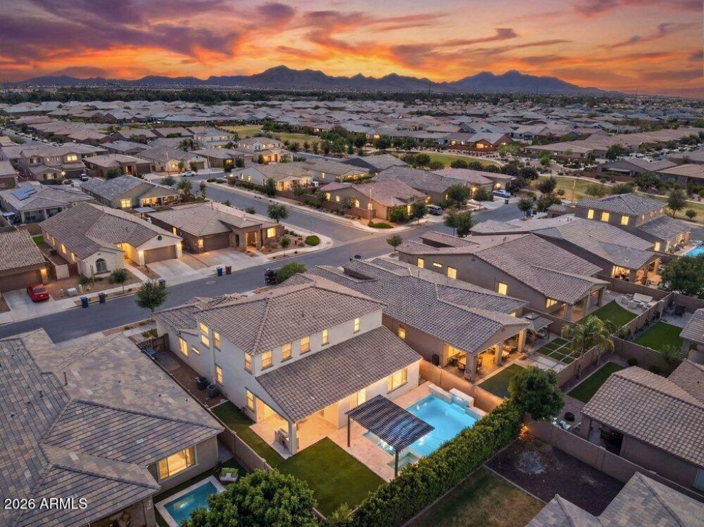 Impeccably upgraded and move-in ready, this residence blends refined interior finishes with resort-style outdoor living designed for everyday enjoyment. Every detail has been elevated. Enjoy a private backyard retreat designed for elevated outdoor living, featuring a grotto-style heated pool with baja step and spillover spa, expansive travertine decking, lush artificial turf, a covered patio for shaded lounging, and a built-in natural gas BBQ ideal for entertaining. Surrounded by thoughtfully designed spaces for both relaxation and gathering, this resort-inspired setting offers privacy, ambiance, and the kind of indoor-outdoor lifestyle that makes home feel like a getaway.Inside, extensive improvements include fresh interior paint, updated flooring, upgraded baseboards and door trim, framed windows on the main level, designer lighting, upgraded plumbing fixtures, soft-close kitchen drawers, and blinds throughout. The kitchen is well-appointed with Whirlpool appliances, an induction double oven, Bosch dishwasher (2024), reverse osmosis system, and gas tankless water heater for added efficiency. The primary suite is thoughtfully located on the main level for added privacy, while an additional secondary bedroom is also downstairs, offering flexibility for guests, multigenerational living, or a home office. Upstairs, a spacious loft provides additional living space, accompanied by the remaining secondary bedrooms and a full bath, creating a well-designed layout with separation and functionality.Located in the highly desirable Meridian community, residents enjoy access to amenities including a community pool, splash pad, parks, walking trails, and neighborhood gathering spaces. Ideally positioned near many of Queen Creeks favorite hotspots, including shopping, dining, entertainment, and convenient access to the Loop 24, this home offers not just exceptional living, but an outstanding lifestyle.Designed for both comfort and function, this home offers a rare combination of thoughtful upgrades, energy-conscious features, and exceptional indoor-outdoor living. A true move-in ready opportunity.