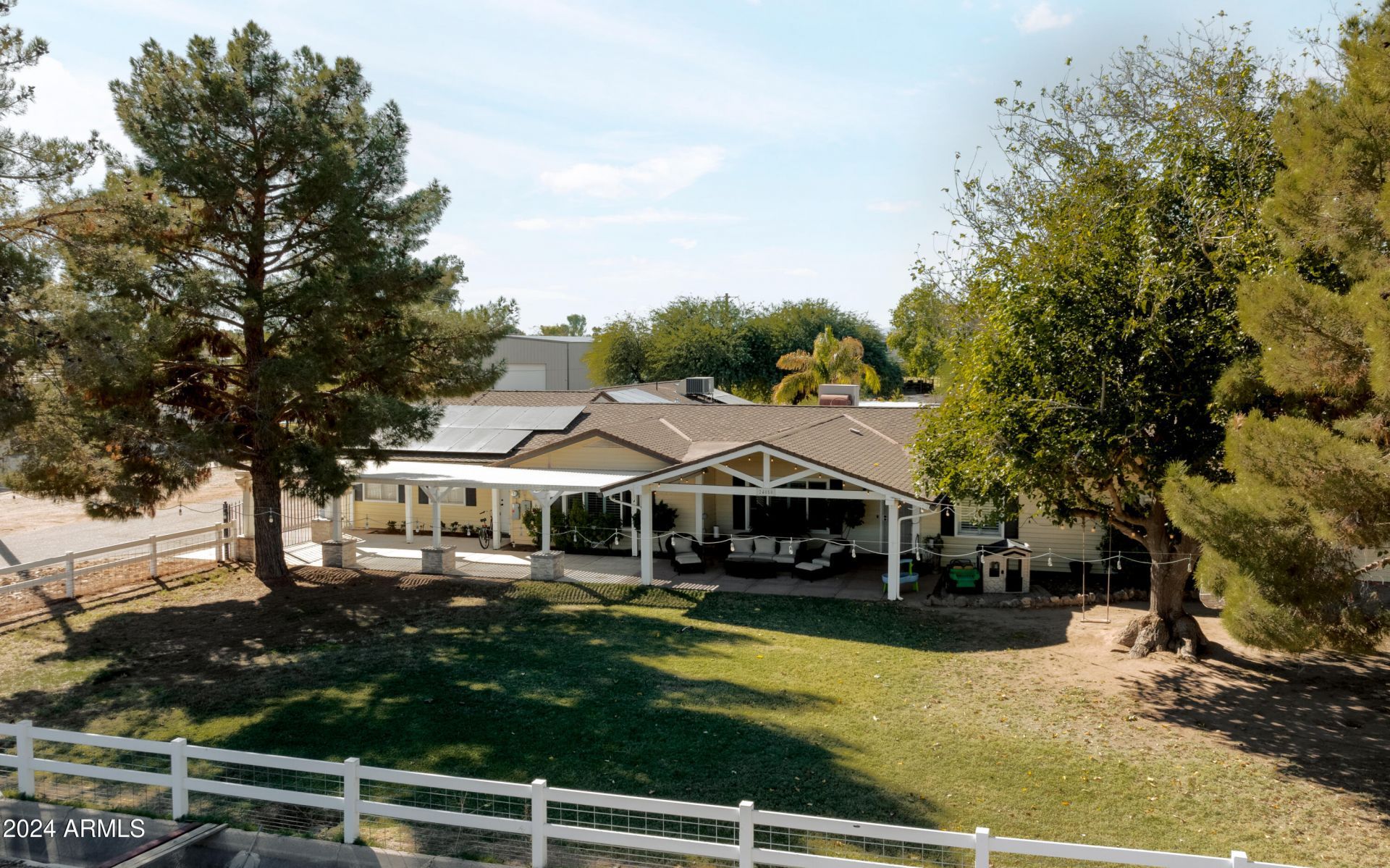 A rare opportunity to own a 2,400 sq ft indoor basketball court set on 1.5 acres in a Chandler County Island. This 3,900 sq ft farmhouse offers 5 bedrooms, including 2 primary suites, 3 bathrooms, a mudroom, oversized laundry, solar panels, and a 4-car garage. The open-concept kitchen is designed for gathering with a large island, granite counters, double ovens, ample storage, and a spacious dining area. An attached casita with private entrance features its own primary suite, living room, and kitchen--ideal for guests or multigenerational living. The backyard includes a pool, covered patios, built-in grill, and fire pit, while the front offers mature trees, swings, and white picket fencing.