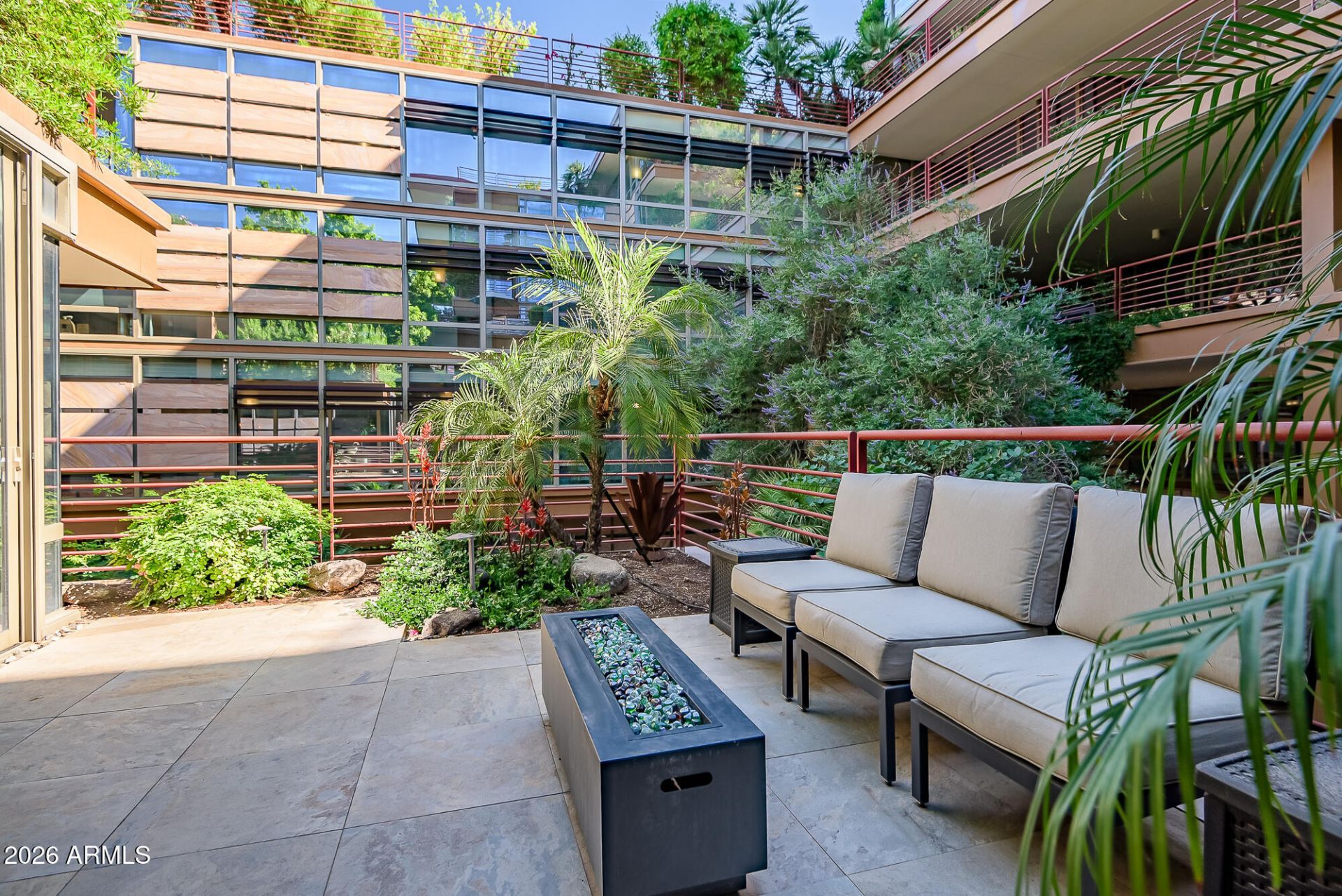 One of a kind Optima Camelview 1 bedroom + den masterpiece. Here you have it! Theres nothing like this unit in the entire Optima Camelview Village. From the moment you walk in, floor to ceiling glass begins and continues all the way through the large den/office space. As you enter the living space your eyes will witness the newly made renovations in this unit. To start, you will be amazed by the 612sqft. completely renovated patio with rare gas firepit. Perfect for relaxing and entertaining. 72 breathtaking fireplace accent wall boasted as the centerpiece of the living room accompanied with a very rare skylight that only a limited number of units possess in Optima. Plus so much more you will have to see in person! All found within the luxurious Optima Camelview Village, with its unbeatable location & state of the art architecture/amenities. Amenities include: Two Outdoor Zen Pools, Spas & BbqsOne on each side of the community (heated year round). 24,000 sq. ft. Fitness Center (Recently Remodeled). Mens & Womens Locker Rooms w/ Steam Rooms, Showers and Private Lockers. Indoor Lap Pool & 2 Spas (Heated year round), On-site concierge, Putting green, Hybrid Basketball / Pickle-ball Court, Racquet ball court, On-site restaurant (metropolis), conference room, 24/7 Security, Reservable party room and multi-purpose fitness/yoga room.